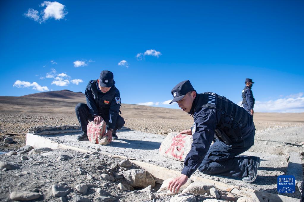 普瑪江塘邊境派出所的移民管理警察們在巡邏時,扶起被大風吹倒的就地取材制作的“危橋”警示牌(11月20日攝)。新華社記者 孫瑞博 攝