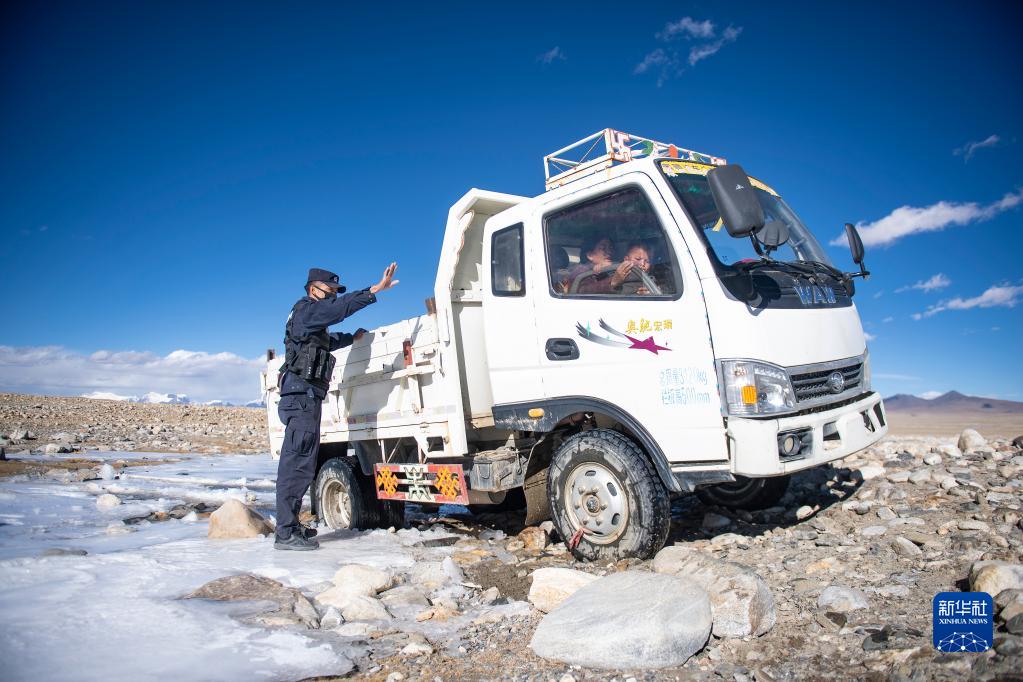 普瑪江塘邊境派出所的移民管理警察幫助牧民旦增多杰的家人離開困在冰河里的小貨車(11月20日攝)。新華社記者 孫瑞博 攝