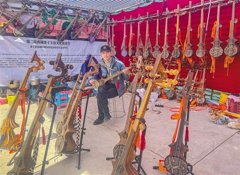 圖為銷售民族樂器的商戶正在為消費(fèi)者現(xiàn)場彈奏“扎念”。