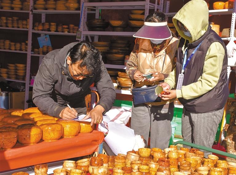 山南本地的特色優(yōu)質(zhì)商品尤其受到青睞:扎囊的氆氌,洛扎的粉絲,瓊結(jié)的蕎麥面,加查的核桃、木碗,貢嘎的邦典、紅土豆,措美的奶渣、牛羊肉等等,紛紛占據(jù)重要展位,引來消費(fèi)者紛至沓來,熱情選購。