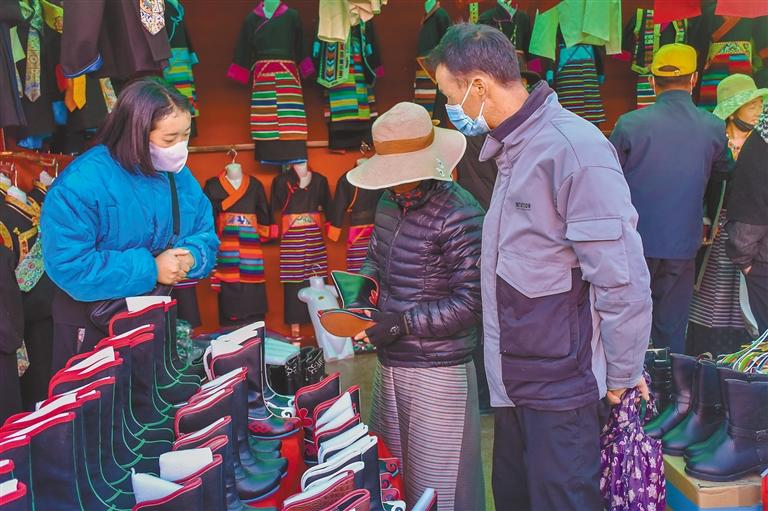 圖為消費(fèi)者正在選購藏靴。