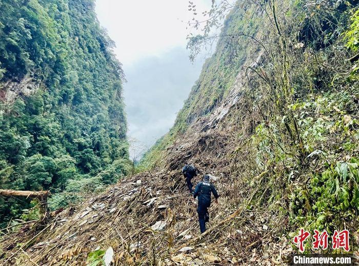 西藏自治區(qū)墨脫縣背崩鄉(xiāng)的原始叢林是戍邊民警日常巡邏之地。1月26日中午,中新社記者隨背崩邊境派出所民警一道,踏上了原始叢林中的巡邏路。圖為背崩邊境派出所民警經(jīng)過(guò)泥石流沖刷區(qū)。 中新社記者 冉文娟 攝
