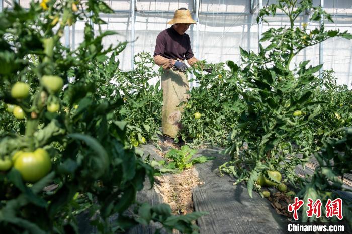 圖為28日,白朗中農圣域農牧科技有限公司工作人員在為大棚番茄授粉。江飛波 攝