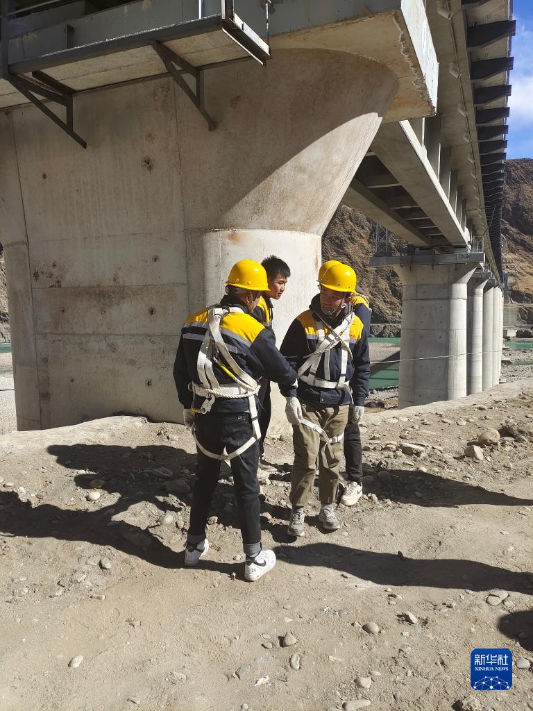 冷達(dá)2號(hào)雅魯藏布江特大橋橫跨雅魯藏布江。“90后”橋隧工趙浩澤穿著亮黃色安全馬甲,系好安全帶,開(kāi)始檢查抗震樁、支座和支撐墊石的情況。
