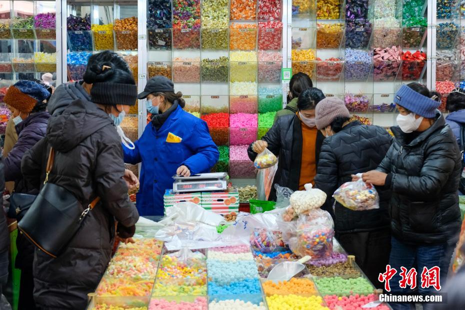 目前正值藏歷12月下旬,西藏即將迎來傳統(tǒng)藏歷水虎新年,拉薩民眾也全面進(jìn)入“藏歷新年時(shí)間”。2月27日下午,小新在西藏最大的傳統(tǒng)綜合市場(chǎng)——拉薩沖賽康市場(chǎng)周邊看到,羅薩美朵、卡塞、酥油、切瑪盒、糖果、干果、藏式服裝等年貨琳瑯滿目,購買的市民也進(jìn)入“最后”的采購時(shí)間,市場(chǎng)周圍人群絡(luò)繹不絕,高原迎春、年味十足。圖為一商販在拉薩沖賽康市場(chǎng)周邊銷售藏歷新年年貨“褪”。江飛波 攝