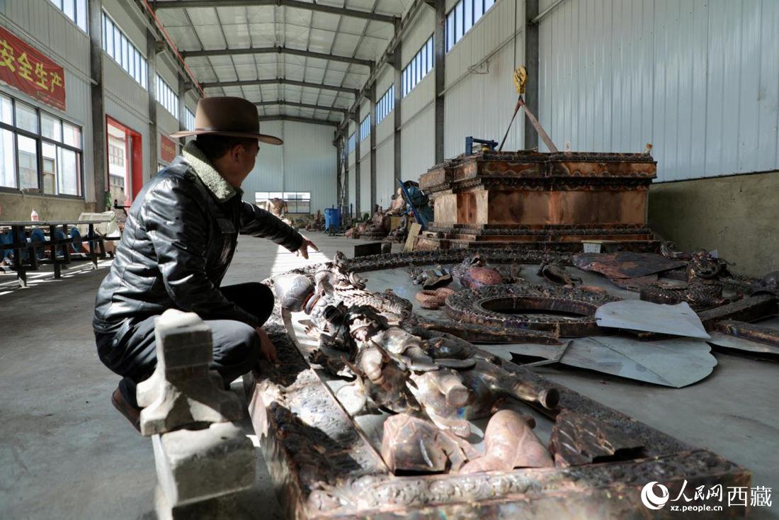 工廠內(nèi)傳承人羅布占堆講述鍛銅制作過程。人民網(wǎng) 次仁羅布攝