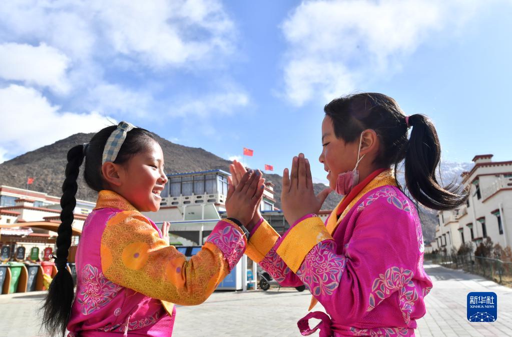 兩位搬遷牧民家的小姑娘穿上盛裝,在榮瑪高海拔生態(tài)搬遷點(diǎn)做游戲(2月28日攝)。新華社記者 覺果 攝