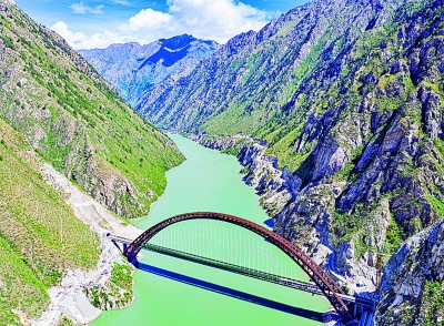 復興號列車行駛在川藏鐵路拉林段藏木特大橋。新華社發(fā)