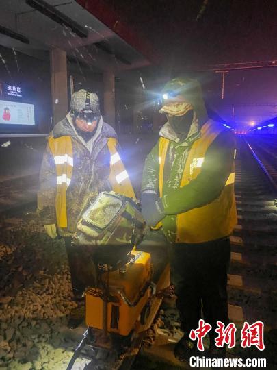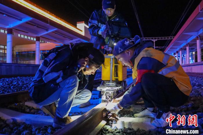 工人夜間對(duì)拉林鐵路鋼軌進(jìn)行病害檢測(cè)?!±痛稳?攝
