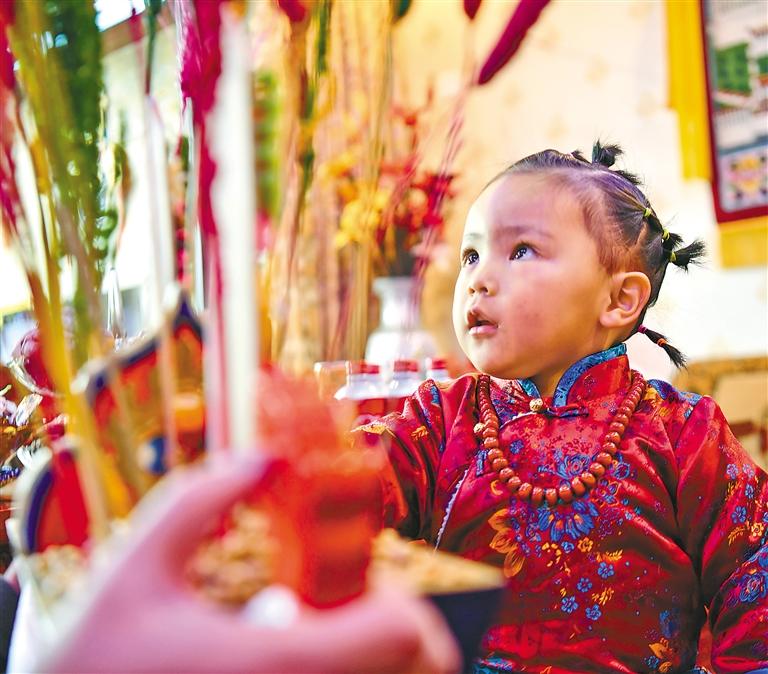 藏歷新年期間,西藏各地群眾以多種方式歡度新年。圖為身著藏裝的小姑娘在吃“切瑪”。新華社記者 晉美多吉 攝