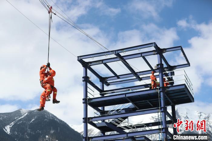 圖為消防指戰(zhàn)員利用橫渡系統(tǒng)轉(zhuǎn)運(yùn)傷員。 林芝市森林消防支隊(duì) 攝