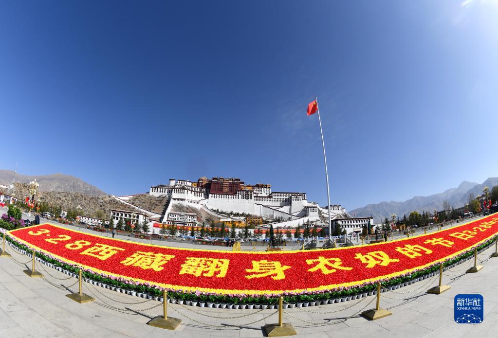 63年后的今天,春風(fēng)和煦,陽光明媚。上午9時(shí)40分,在《翻身農(nóng)奴把歌唱》的伴奏下,西藏各族各界群眾代表聚集在拉薩布達(dá)拉宮廣場(chǎng)。蔚藍(lán)的天空下,和平鴿展翅翱翔。
