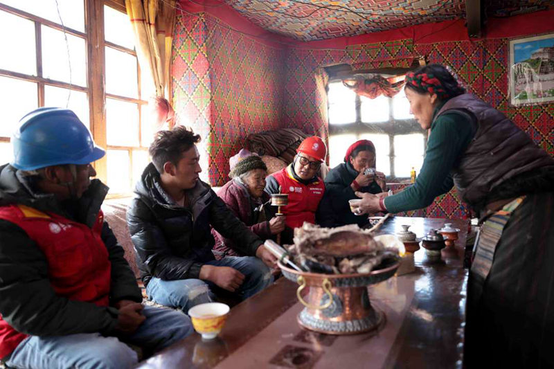 國(guó)網(wǎng)墨竹工卡縣供電公司員工與讓桌家人一起談?wù)撝?。閆昱翰攝