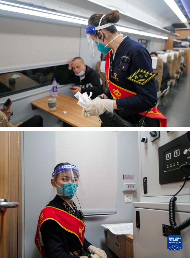 拼版照片:上圖為3月27日,劉文靜在列車上檢查衛(wèi)生;下圖為劉文靜在列車廣播室。C893次列車長(zhǎng)劉文靜已經(jīng)在鐵路工作近十年,先后在青藏、拉日、拉林三條鐵路線任職,親身經(jīng)歷十年來(lái)西藏鐵路運(yùn)輸?shù)木拮儭P氯A社記者 洛卓嘉措 攝