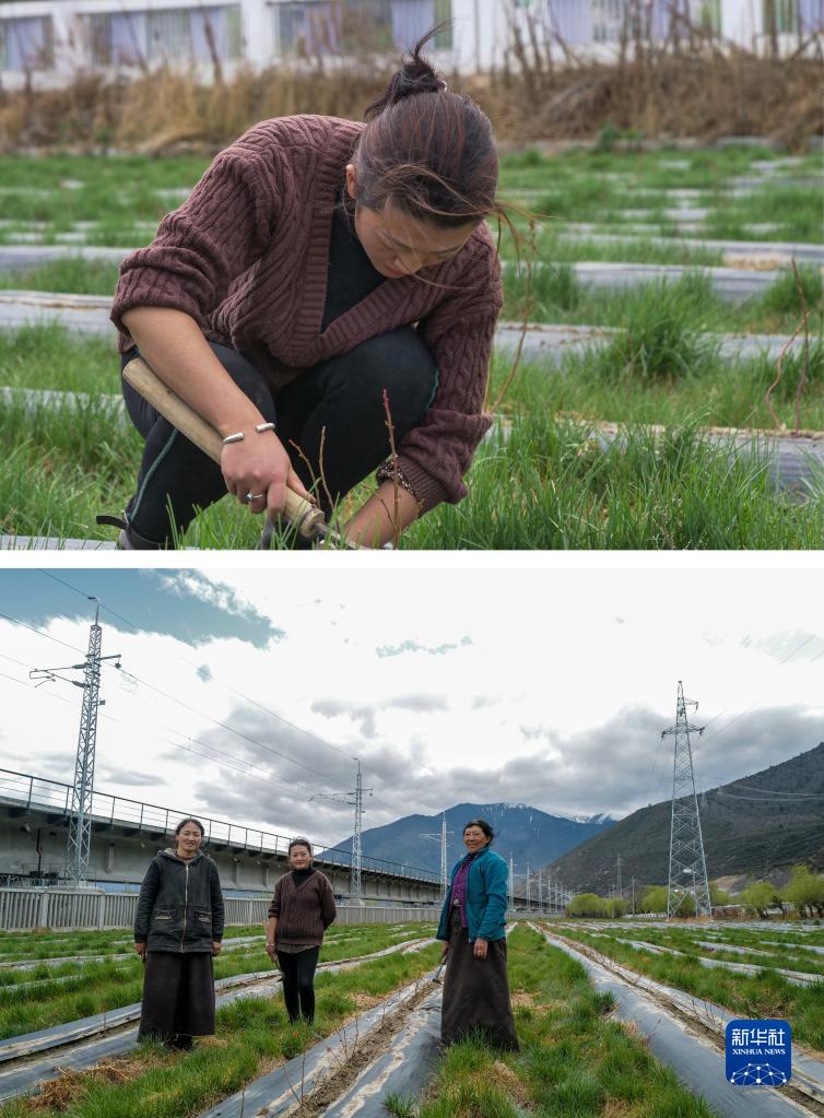 拼版照片:上圖為3月30日,尼瑪?shù)录谒{(lán)莓種植基地工作;下圖為尼瑪?shù)录ㄖ校┘巴抡驹谒{(lán)莓種植基地中,背后是鐵路橋。麥巴村村民尼瑪?shù)录衲陝倽M20歲,此前在林芝巴宜區(qū)一家藏餐館打工,后來(lái)回到村里設(shè)立的藍(lán)莓種植基地工作。尼瑪?shù)录f,能在家門口工作令她很開心,她每天都能看到火車從旁邊經(jīng)過,希望有一天也能坐上火車去拉薩逛一逛。新華社記者 洛卓嘉措 攝