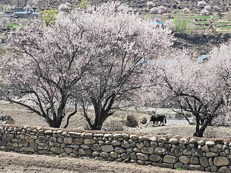 圖為尼屋鄉(xiāng)農牧民養(yǎng)殖的牛在桃林里悠閑地散步。