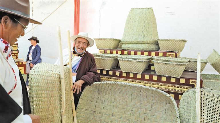 圖為尼屋鄉(xiāng)農牧民曲加在第七屆“尼屋桃花節(jié)”特色產品展銷區(qū)域售賣自己手工編織的竹筐。記者 萬靖 通訊員 索朗 攝
