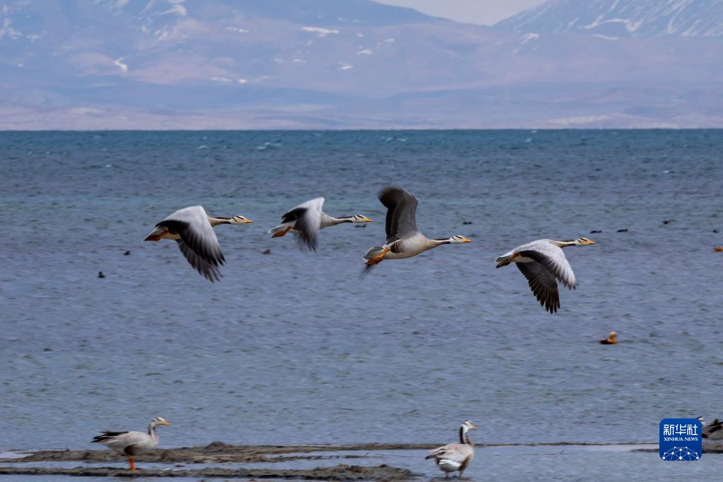4月22日,鳥(niǎo)類在西藏阿里地區(qū)普蘭縣境內(nèi)瑪旁雍錯(cuò)飛翔。新華社發(fā)(劉曉東攝)
