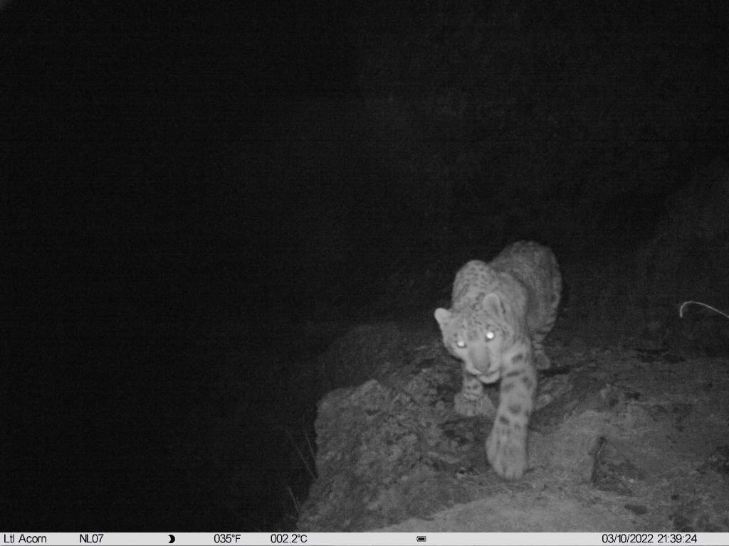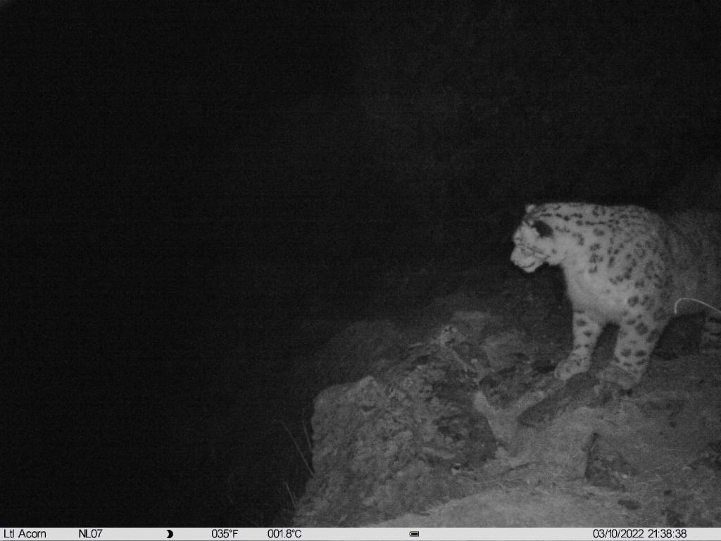 紅外相機(jī)監(jiān)測照片顯示,今年3月,一只成年雪豹走到了一臺位于山脊線上的紅外相機(jī)觸發(fā)裝置前,不斷地上前用鼻子觸碰,并且淘氣地在鏡頭前呼出了一股熱氣。