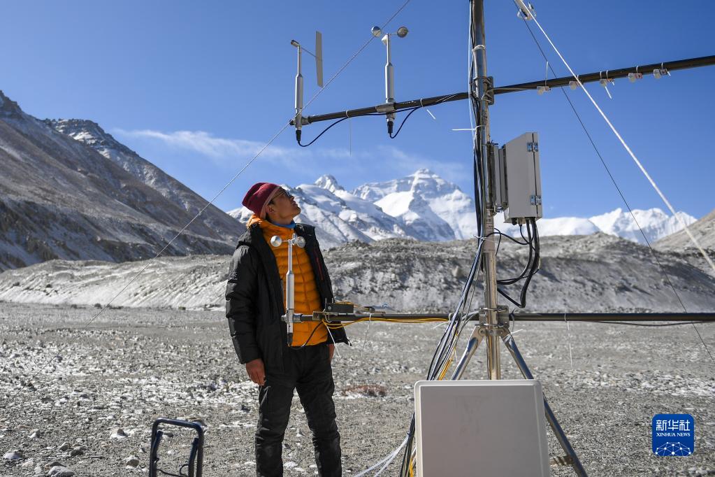 5月2日,在珠峰登山大本營,科研人員檢查測風雷達。新華社記者 姜帆 攝