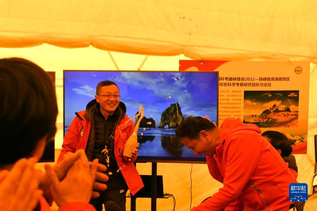 在珠峰腳下海拔5200米的總指揮會(huì)議室?guī)づ窭铮蠹覠崃覒c?!皫p峰使命”珠峰科考登頂觀測(cè)采樣成功(5月4日攝)。新華社記者 姜帆 攝