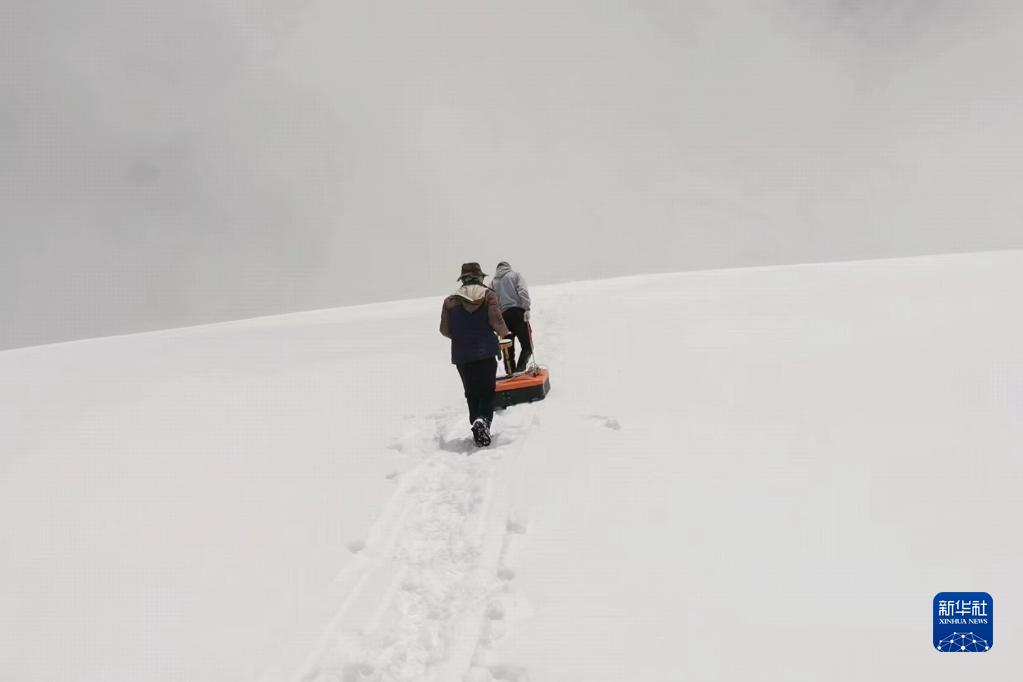 科考人員拉著冰川雷達測厚儀開展測量工作。(受訪者供圖)