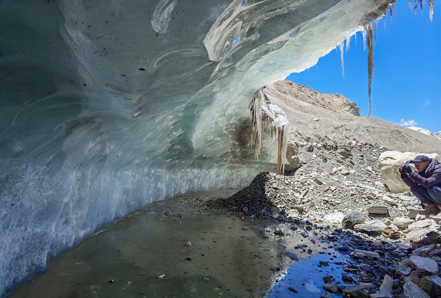 冰川與污染物小組在東絨布冰川觀察測(cè)量(5月5日攝,手機(jī)照片)。新華社發(fā)(受訪者供圖)