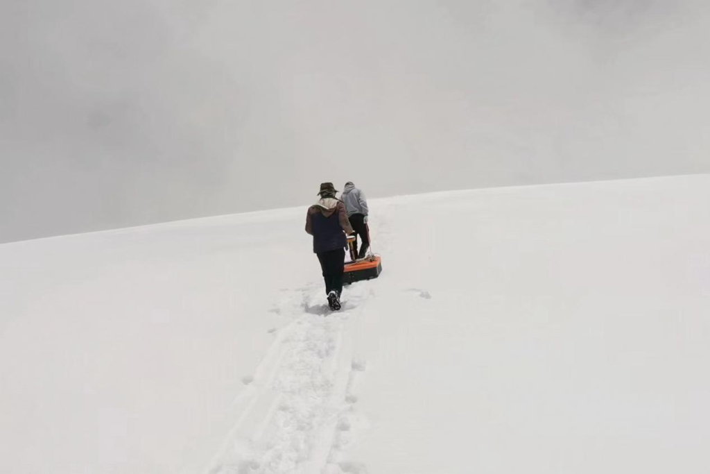 科考隊(duì)員拉著冰川雷達(dá)測(cè)厚儀開(kāi)展測(cè)量工作。新華社發(fā)