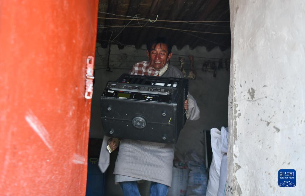 在西藏當雄縣拉多村,羅珠在準備放映電影所需的器材(5月20日攝)。新華社記者 卞婷 攝