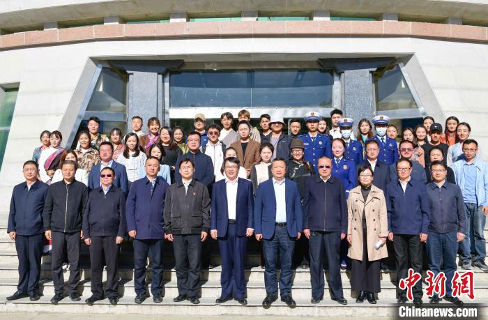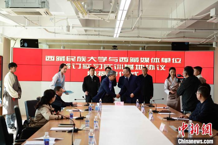 圖為簽約儀式上媒體單位負(fù)責(zé)人跟西藏民族大學(xué)的實(shí)習(xí)生合影?!∝暩聛?lái)松 攝