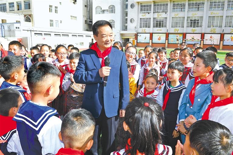 拉薩市第一小學(xué)是西藏和平解放后拉薩開辦的第一所公立小學(xué)。今年將召開黨的二十大,學(xué)校迎來建校70周年,這個(gè)主題隊(duì)日活動(dòng)格外有意義。上午9時(shí)30分許,王君正來到拉薩市第一小學(xué),朝氣蓬勃的少先隊(duì)員代表迎上前高聲問好,并為王君正系上鮮艷的紅領(lǐng)巾,主動(dòng)牽著他的手走向校園。