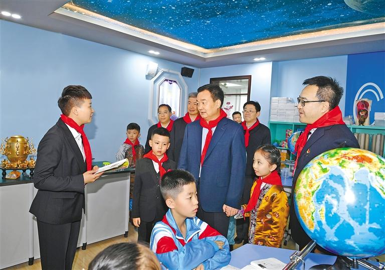 拉薩市第一小學(xué)正在開展的“鑄牢中華民族共同體意識(shí)”少先隊(duì)活動(dòng)課豐富多彩。音樂室里孩子們演奏的六弦琴韻律歡快,王君正駐足傾聽,夸贊孩子們多才多藝;科技工作室里老師正引導(dǎo)孩子們做科學(xué)實(shí)驗(yàn),王君正認(rèn)真觀看,勉勵(lì)孩子們從小樹立科學(xué)觀念,講科學(xué)、愛科學(xué)、學(xué)科學(xué)、用科學(xué),永葆求知探索之心;走進(jìn)美術(shù)室,看到孩子們埋頭練習(xí),王君正關(guān)切地詢問:“現(xiàn)在孩子們近視的多嗎?”叮囑說,要注意保護(hù)孩子們的視力,呵護(hù)好他們的身心健康。