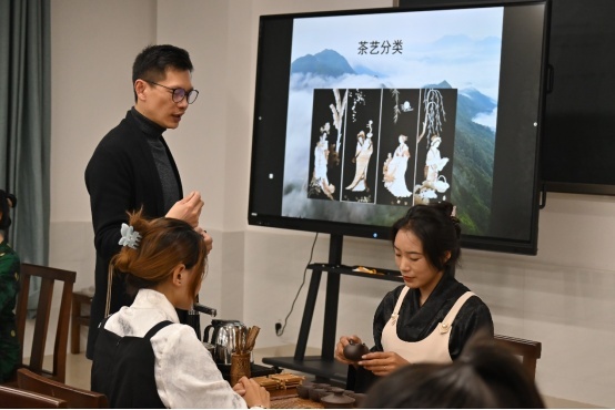 圖為黃淵老師在指導學生進行茶藝實操。