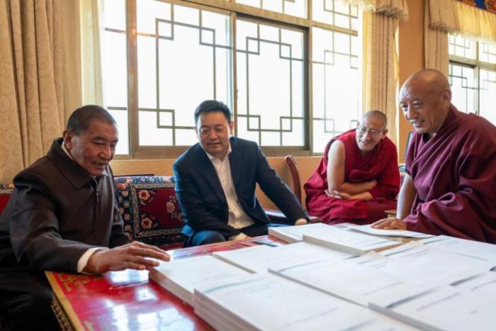 2022年4月15日,西藏自治區(qū)黨委常委、統(tǒng)戰(zhàn)部部長(zhǎng),自治區(qū)政協(xié)黨組副書記、副主席嘎瑪澤登(左二)在西藏佛學(xué)院調(diào)研。 本報(bào)記者 江飛波 攝