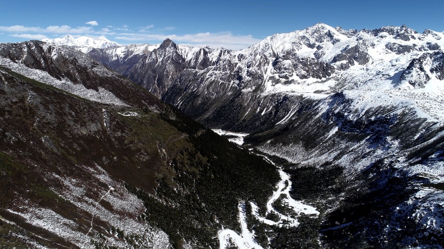 通往西藏洛扎縣拉郊鄉(xiāng)杰羅布村的道路(1月17日攝,無(wú)人機(jī)照片)。新華社記者 韓曦樂(lè) 攝