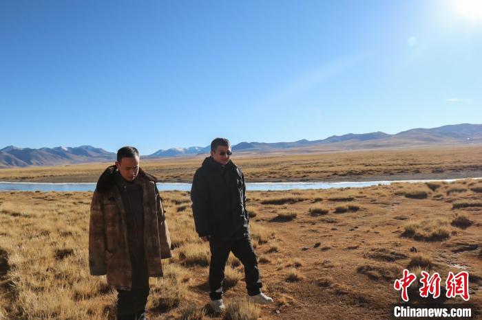 王軍強(右)在申扎縣巴扎鄉(xiāng)查藏藏布巡河。申扎縣委宣傳部 供圖