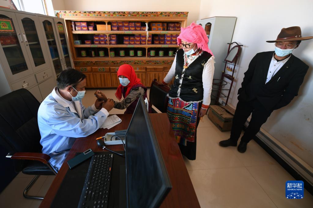 在治多縣索加鄉(xiāng)衛(wèi)生院,布久索南更青(左)為患者把脈(8月11日攝)。新華社記者 范培珅 攝