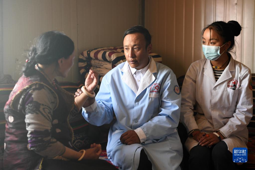 在治多縣索加鄉(xiāng)當曲村,布久索南更青(中)在牧民家給牧民看?。?月11日攝)。新華社記者 范培珅 攝