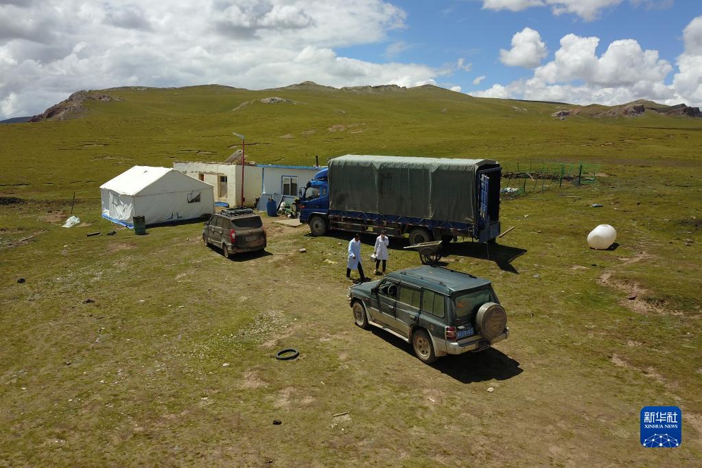 在治多縣索加鄉(xiāng)當曲村,布久索南更青(左)和同事一起前往牧民家中問診(8月11日攝,無人機照片)。新華社記者 范培珅 攝