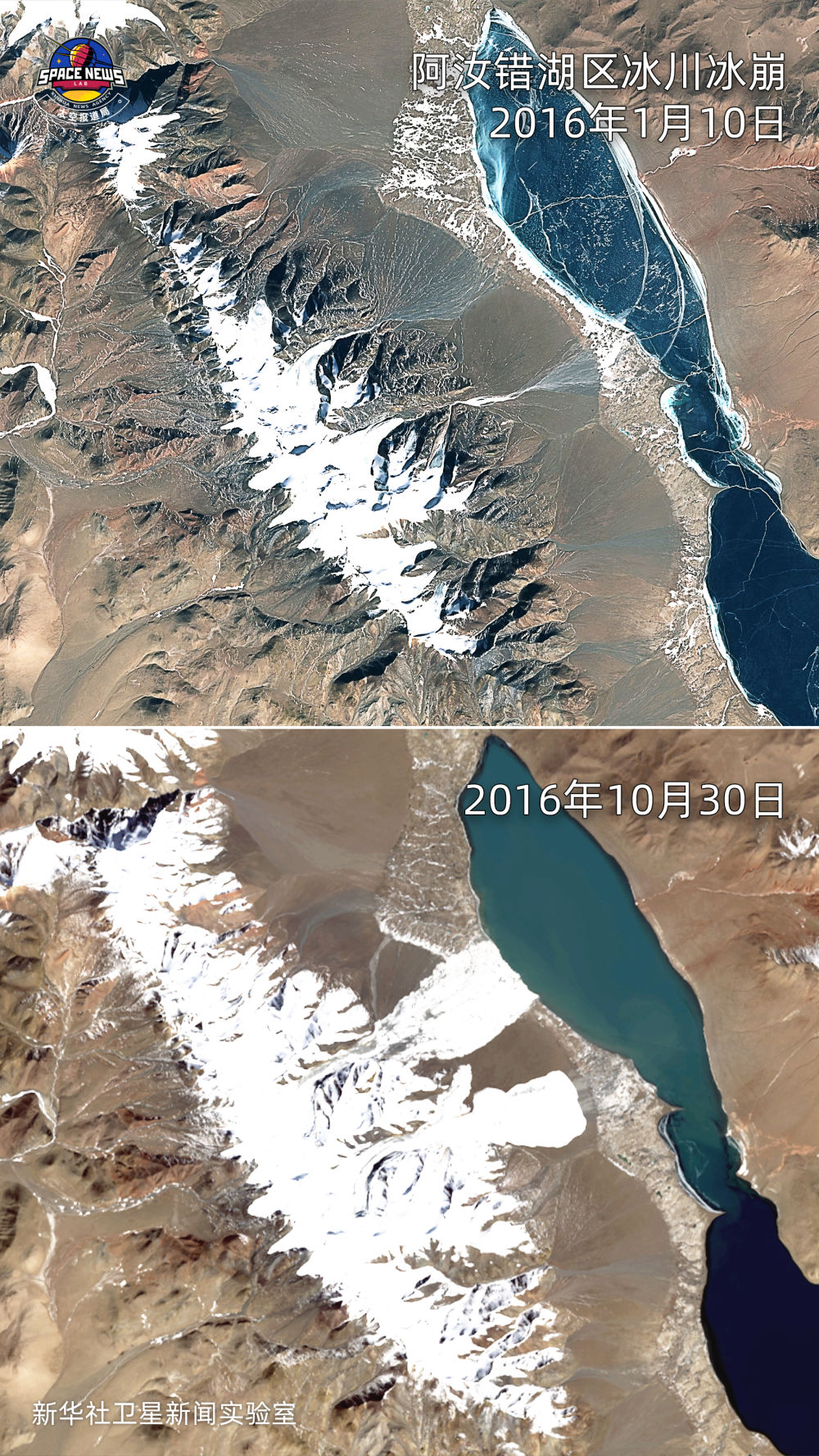 西藏阿里阿汝錯(cuò)湖區(qū),2016年7月和9月先后發(fā)生兩次大型冰崩災(zāi)害,冰崩體攜帶大量碎屑物質(zhì),滑動(dòng)約8公里后沖入阿汝錯(cuò),在湖岸留下兩個(gè)巨大的冰崩扇。