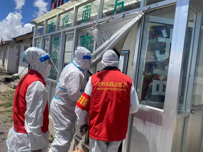 那曲市安多縣帕那鎮(zhèn)新時(shí)代文明實(shí)踐所志愿者對(duì)商鋪進(jìn)行消殺。圖片由那曲市文明辦提供