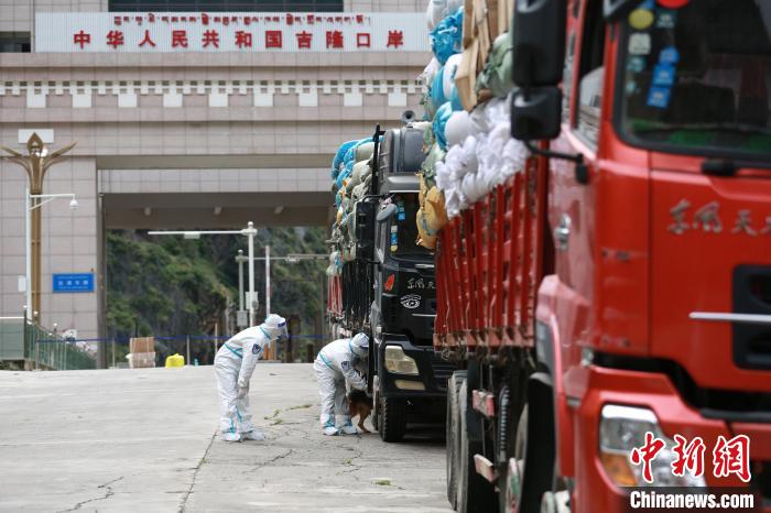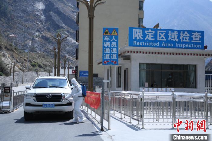 吉隆出入境邊防檢查站移民管理警察對外出口岸限定區(qū)域車輛進(jìn)行消毒。 肖富貴 攝