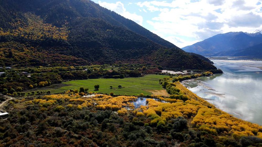 進入深秋,西藏多地已飄下皚皚白雪,米林則依然保持著“雪域江南”的底色,在低海拔地區(qū)甚至還可以找到盛開的小花;往上,就是秋的顏色,豐茂的樹林鑲嵌著縷縷金黃,漸次更替;再往上,越來越多的山頂開始戴上“白色的帽子”,這是雪域高原的本色。春夏秋冬好像都在這個季節(jié)相遇。