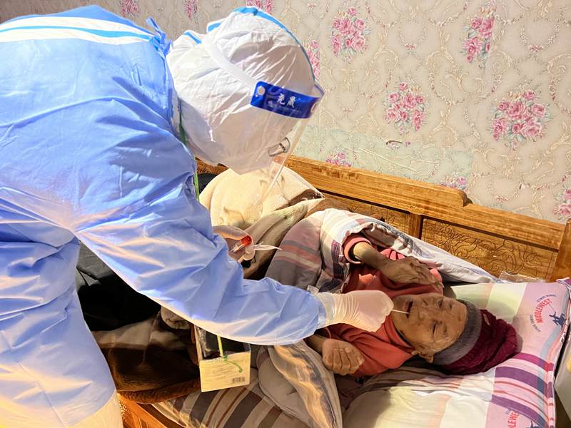 圖為李韜韜上門(mén)為臥病在床老奶奶上門(mén)做核酸。