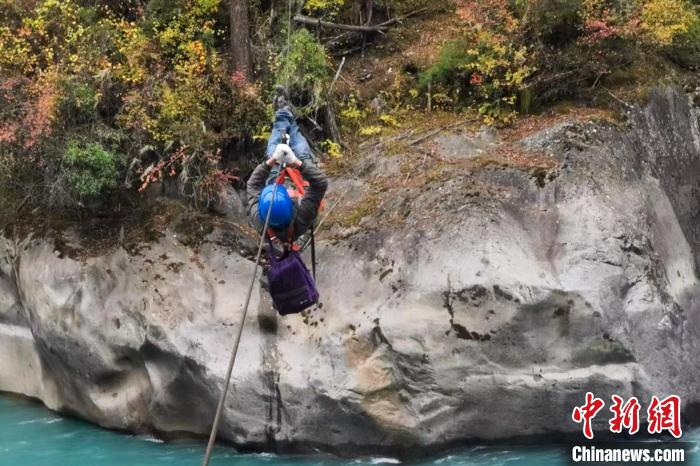 圖為朗尼在巡線完成返回時(shí)溜索過江?!?guó)網(wǎng)波密縣供電服務(wù)中心 供圖