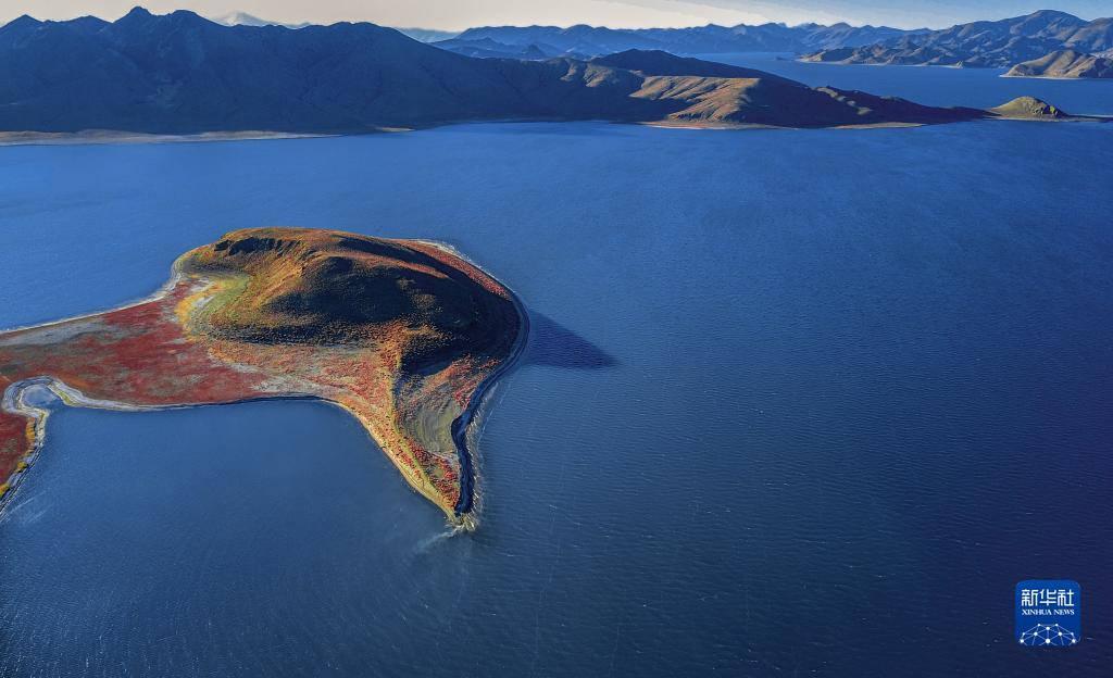 這是夕陽下的羊卓雍錯(cuò)(12月11日攝,無人機(jī)照片)。新華社記者 姜帆 攝