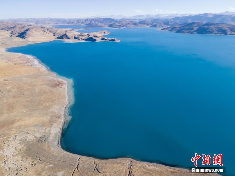 近日,西藏自治區(qū)山南市羊卓雍錯(cuò)(簡稱羊湖),冬日由于沒有云層遮擋,湖水更顯深藍(lán)、孔雀藍(lán)。航拍視角下,湖水像巨大的寶石鑲嵌于高原大地,風(fēng)光壯麗。羊卓雍錯(cuò)藏語意為“碧玉湖”,湖面海拔4441米,與納木錯(cuò)、瑪旁雍錯(cuò)并稱西藏三大“圣湖”。圖為冬日羊湖湖水呈現(xiàn)為“寶石藍(lán)”。 江飛波 攝