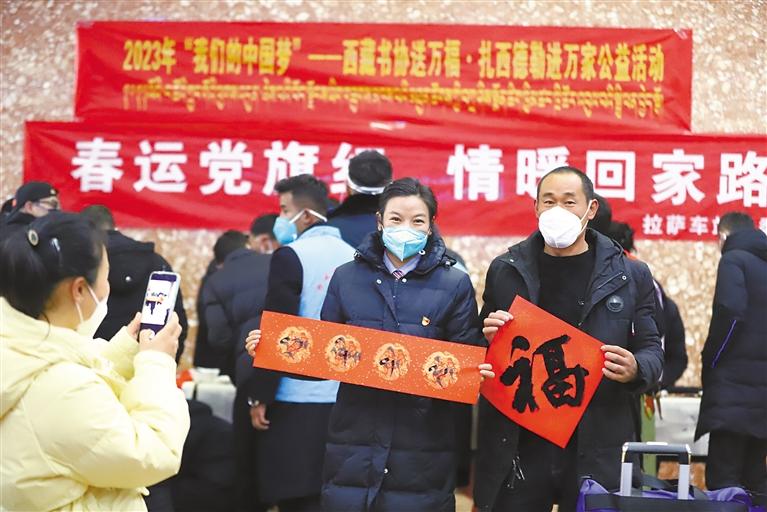 7日,拉薩火車站“天路格?;ā秉h員突擊隊(duì)開(kāi)展兔年大吉心愿墻、新春猜謎送祝福等活動(dòng),提升鐵路運(yùn)輸服務(wù)品質(zhì),讓旅客安心、順心出行。圖為拉薩火車站的工作人員將“福”字送給旅客。記者 楊小娟 旦增蘭澤 攝