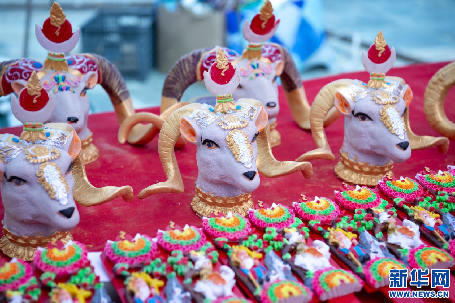 圖為年貨市場(chǎng)上的吉祥羊頭(1月20日攝)。 新華網(wǎng) 旦增努布 攝