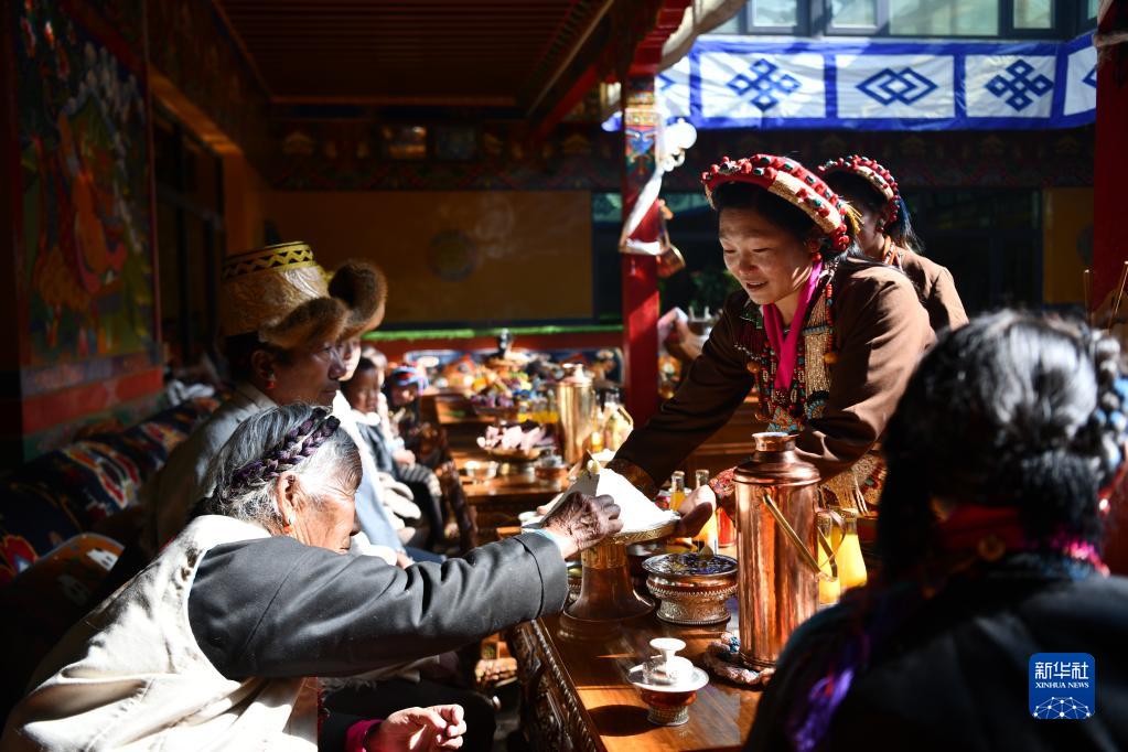 次旦老人接過孫女敬獻的切瑪(1月22日攝)。新華社記者 晉美多吉 攝